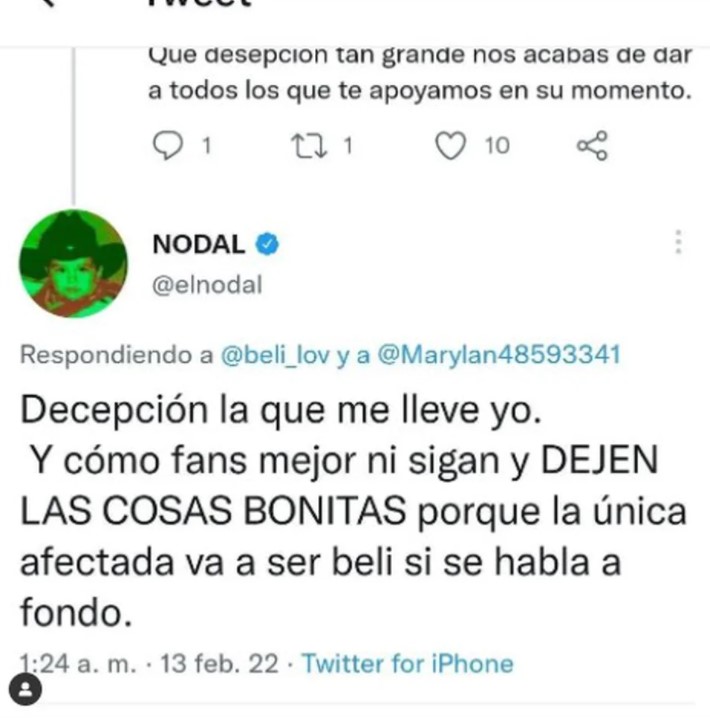 «Eres un poco hombre, Nodal, yo no sé cómo fue que pudo soportar tanto tiempo que estuvieras con ella, en vez de decir tanta mam*ada, agradece que gracias a ella te hiciste conocido», le escribió un miembro del fandom de la cantante: @beli_lov.