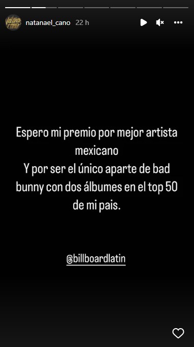 Si Natanael es conocido por algo, es por siempre expresar su opinión ante las cosas que vive y esto le ha traído problemas en el pasado. Sin embargo, en esta ocasión el cantante se volvió tendencia en redes sociales, luego de que lanzara comentarios a través de su cuenta de Instagram a Billboard Latin, ya que la revista de música no lo consideró para recibir un premio en su próxima edición.