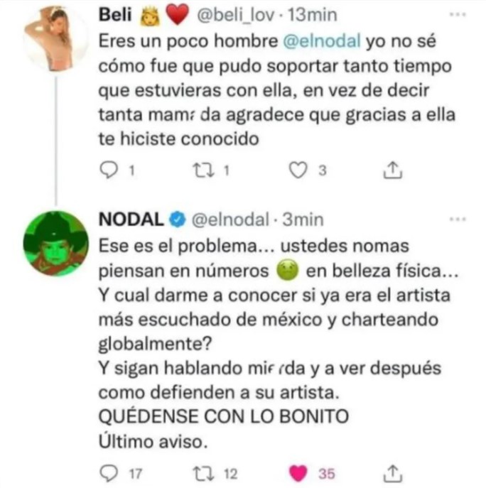 «Eres un poco hombre, Nodal, yo no sé cómo fue que pudo soportar tanto tiempo que estuvieras con ella, en vez de decir tanta mam*ada, agradece que gracias a ella te hiciste conocido», le escribió un miembro del fandom de la cantante: @beli_lov.