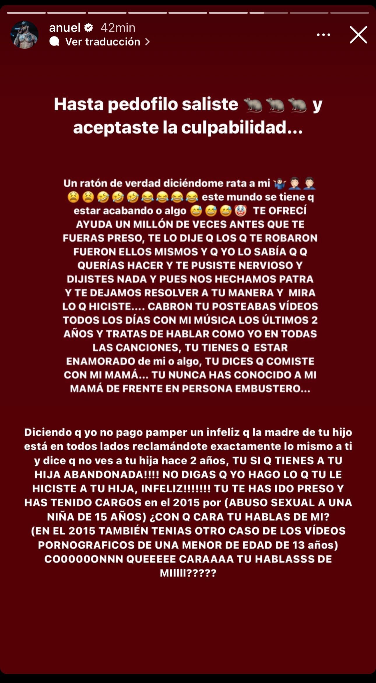 «Tu tocas niñas menores de edad ratón y abusas sexualmente  de ellas. Aléjate de mi hija. Hasta pedófilo saliste y aceptaste la culpabilidad y Yailin no sabe nada de esto. Un ratón de verdad diciéndome rata a mí. Este mundo se tiene que estar acabando o algo. TE ofrecí ayuda un millón de veces antes de que te fueras preso. Diciendo que yo no pago un pamper infeliz que la madre de tu hijo está en todos lados reclamándote exactamente lo mismo a ti y dice que no ves a tu hija hace dos años. Tú sí que tienes a tu hija abandonada. No digas que yo  hago lo que tú le haces a tu hija», escribió Anuel en sus historias.